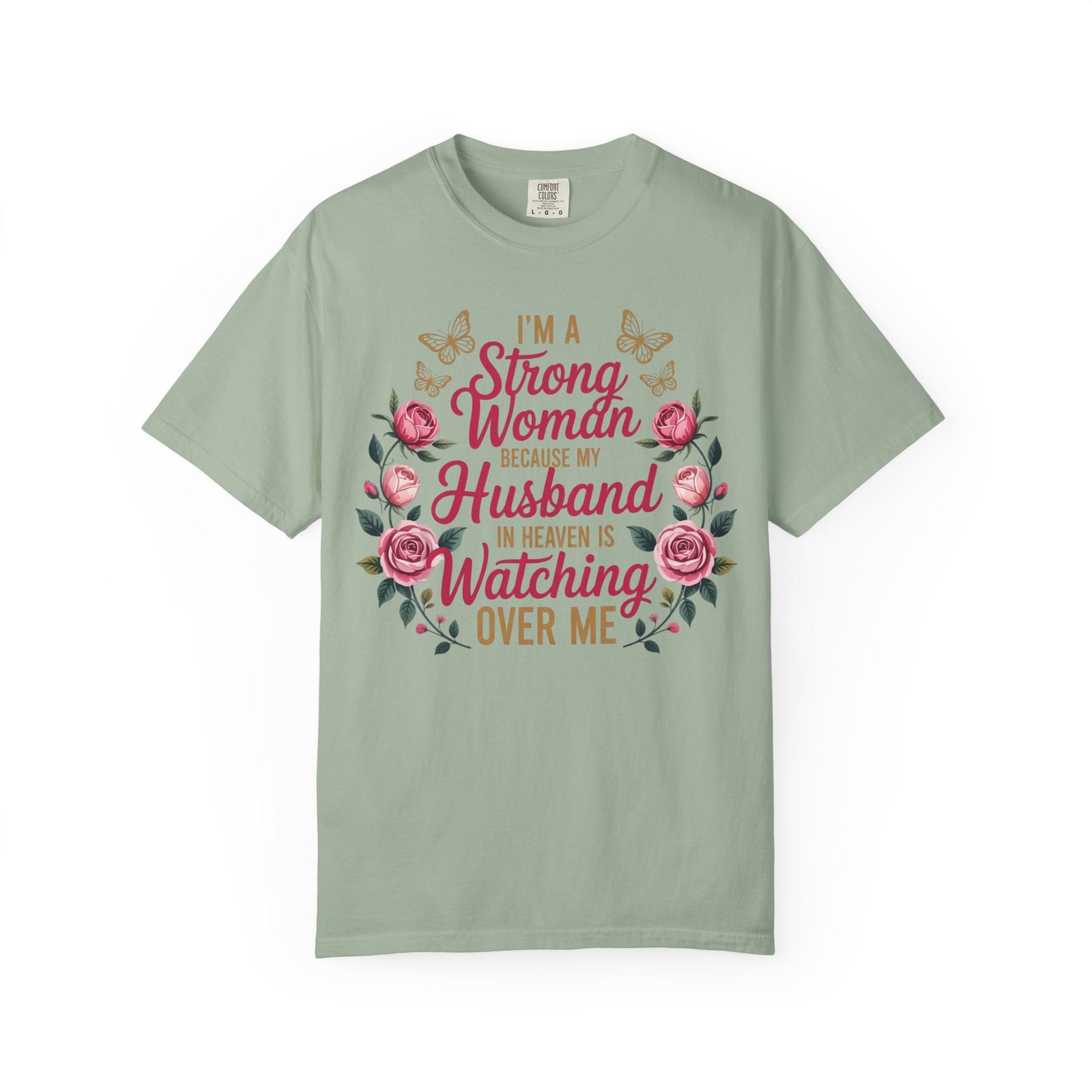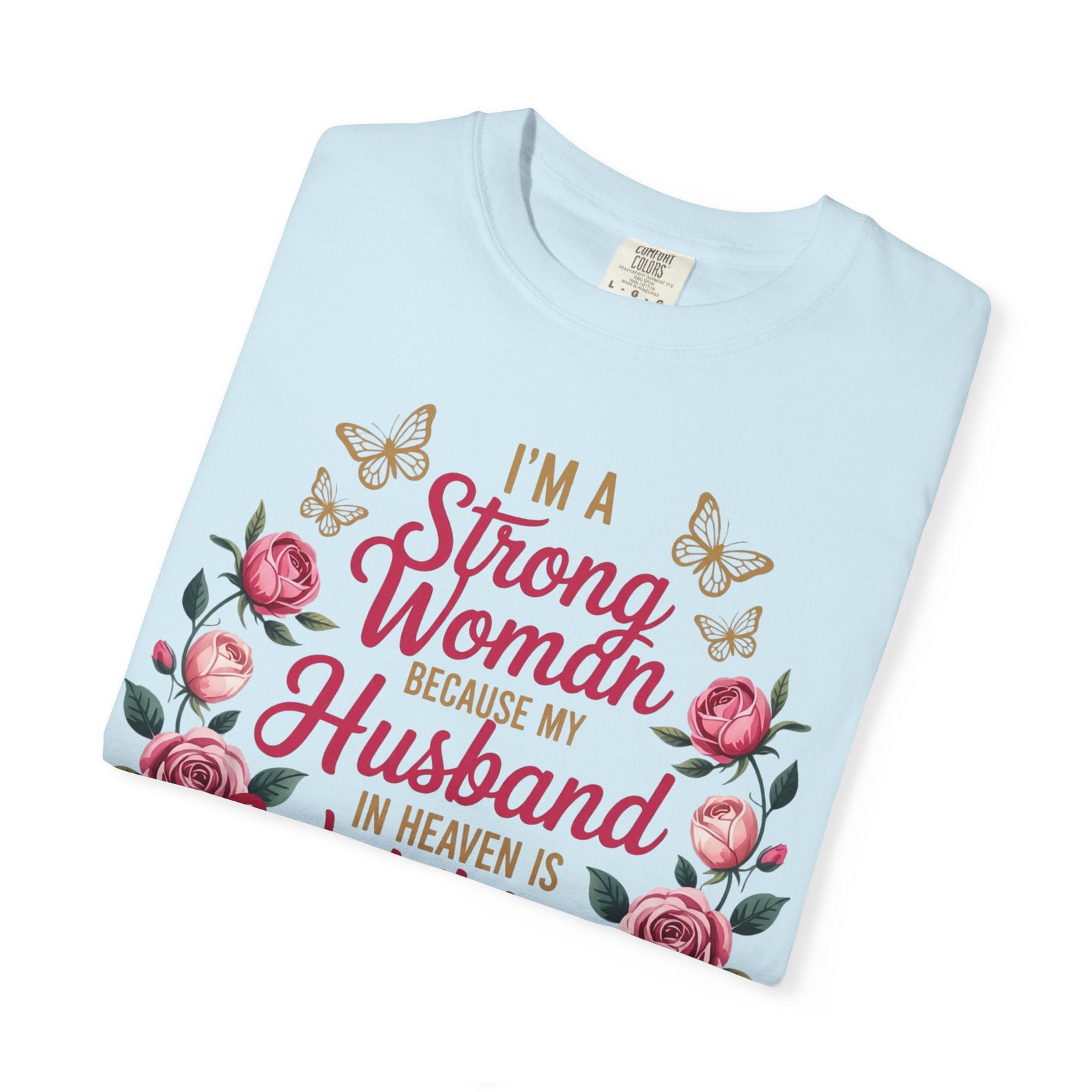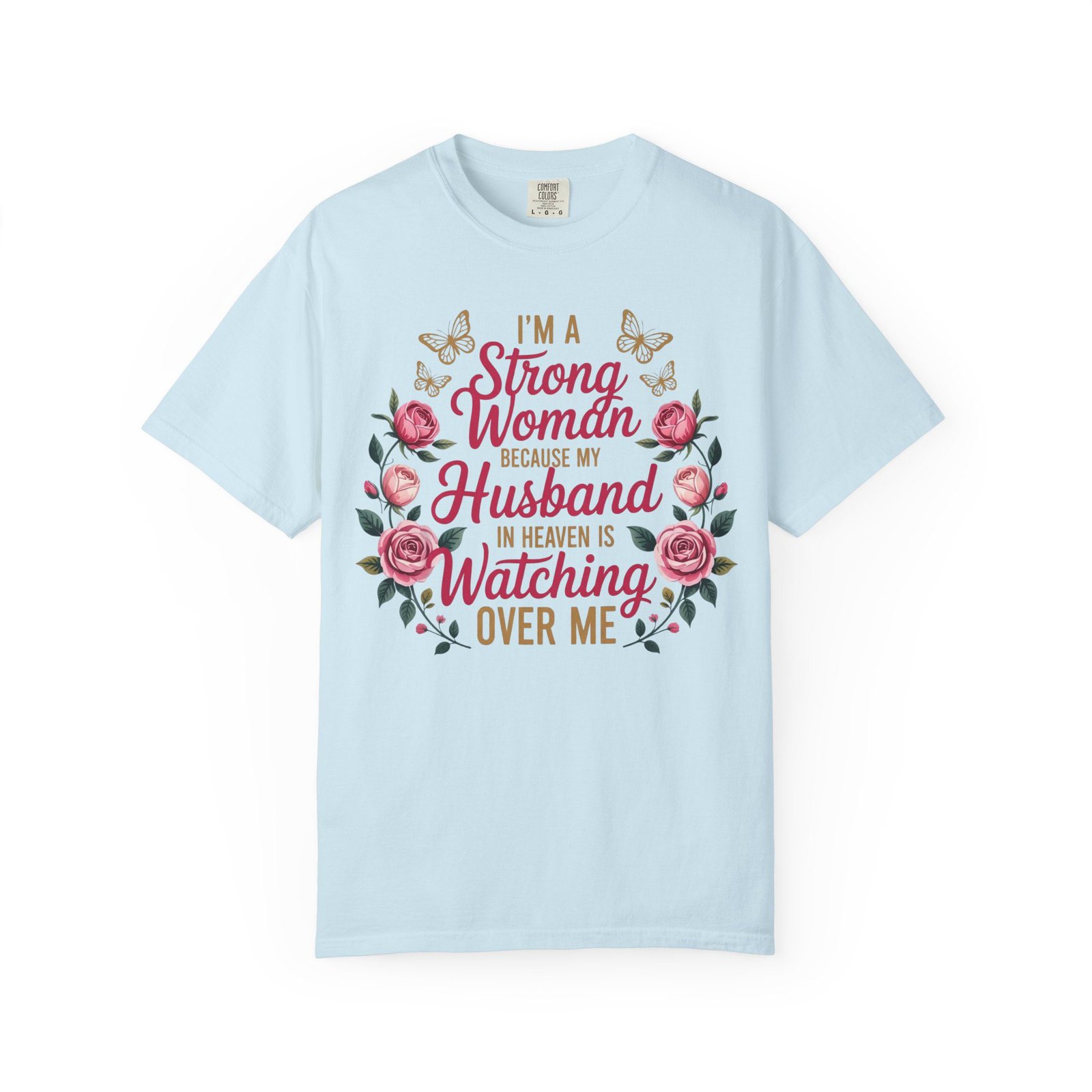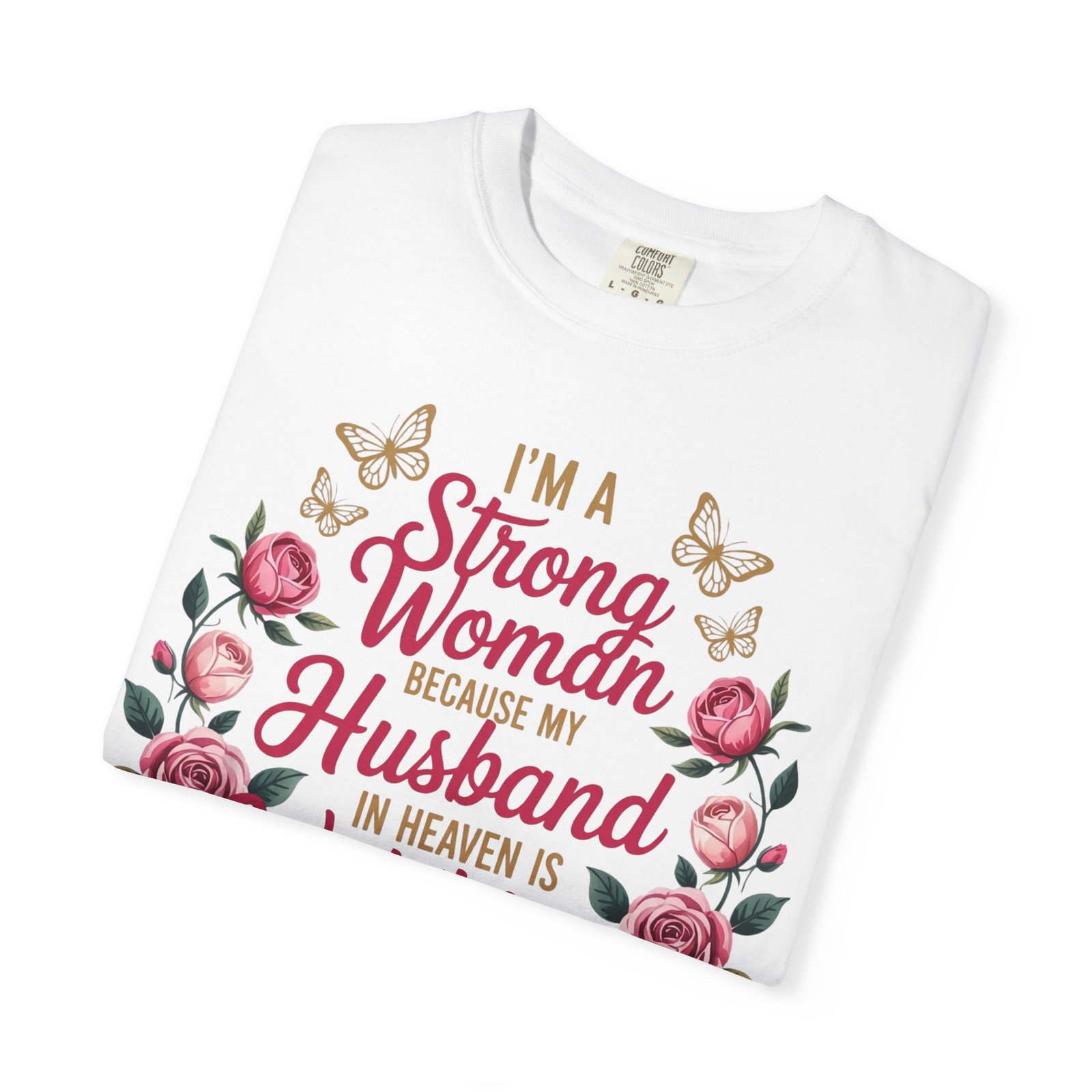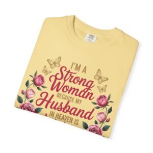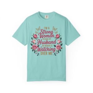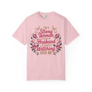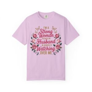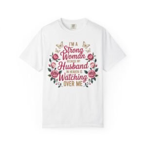 This heartfelt memorial t-shirt features the touching message, “I’m A Strong Woman Because My Husband In Heaven Is Watching Over Me,” surrounded by elegant roses and delicate butterflies. Designed for women honoring the memory of a beloved husband, this shirt offers comfort, beauty, and quiet reassurance in one meaningful piece.
