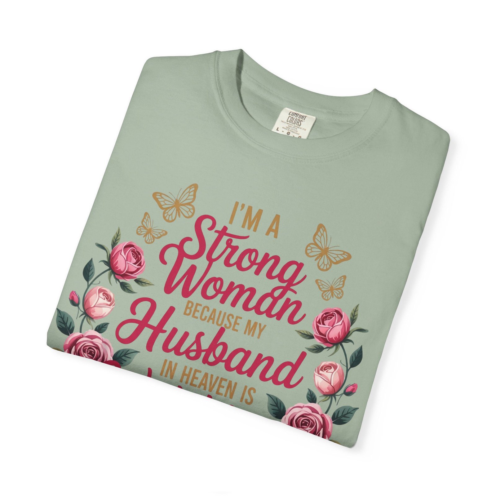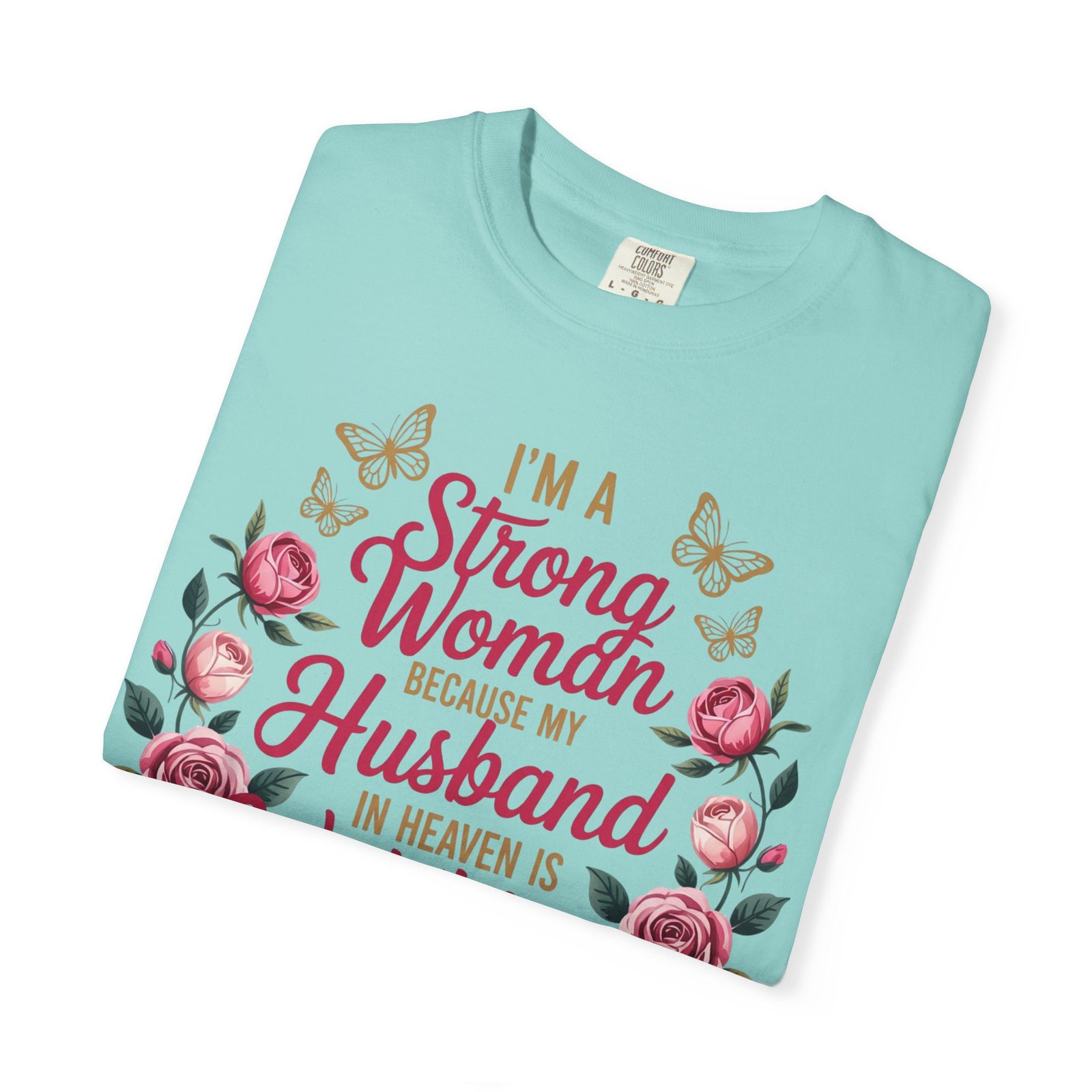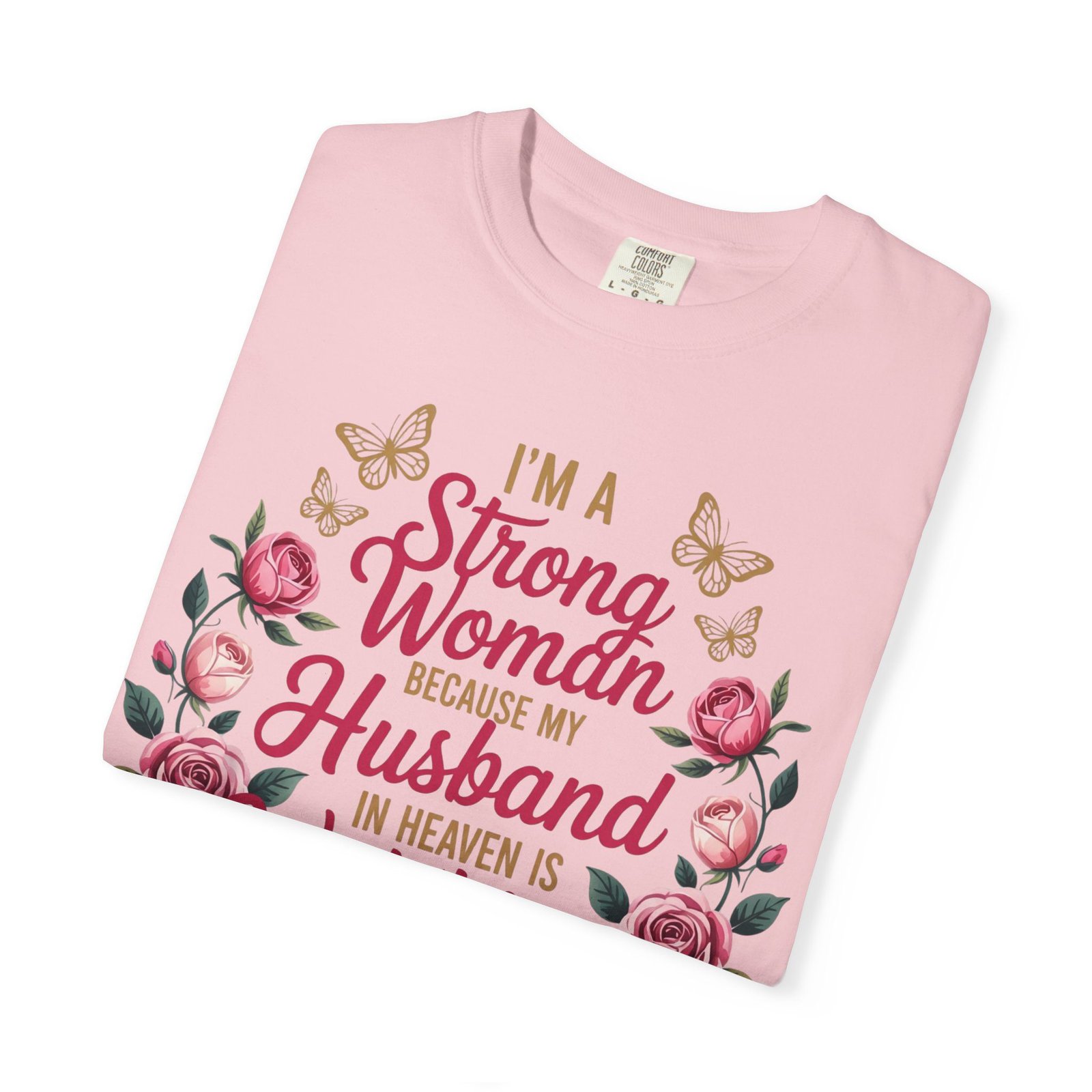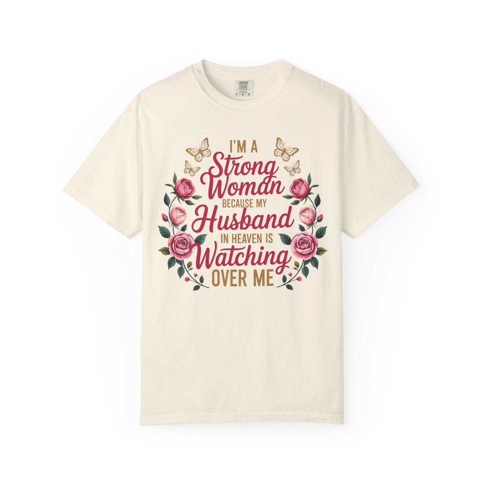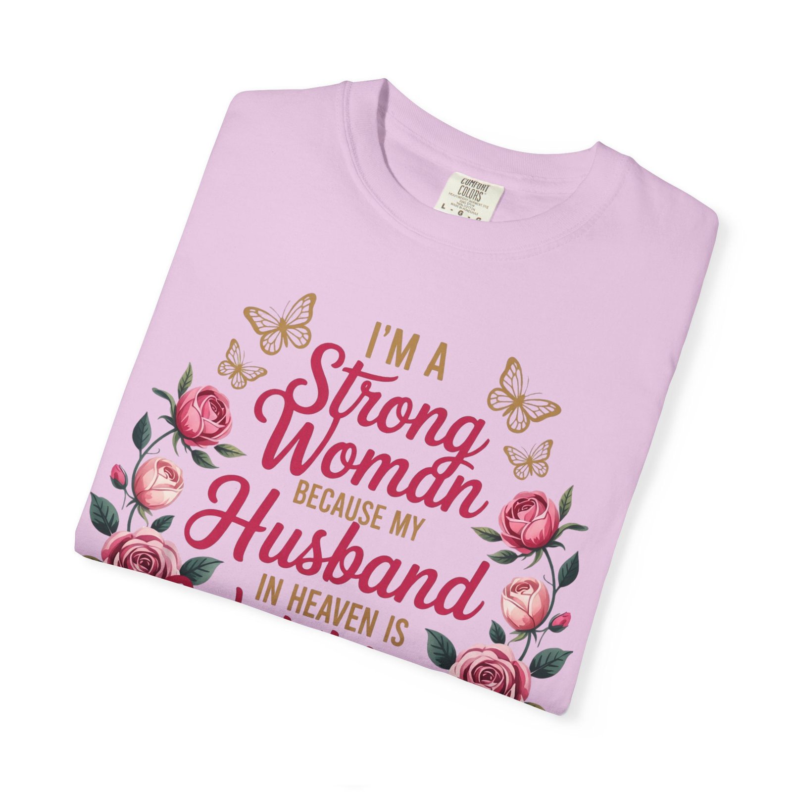 This heartfelt memorial t-shirt features the touching message, “I’m A Strong Woman Because My Husband In Heaven Is Watching Over Me,” surrounded by elegant roses and delicate butterflies. Designed for women honoring the memory of a beloved husband, this shirt offers comfort, beauty, and quiet reassurance in one meaningful piece.
